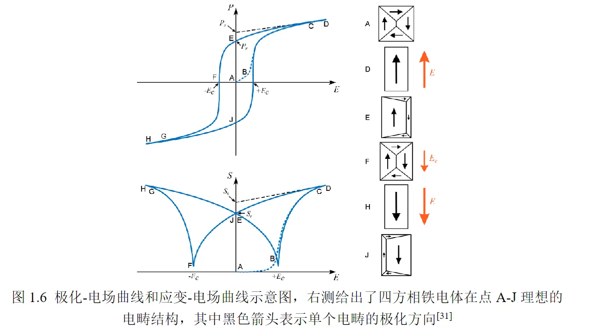 温度高于 时,铁电体表现为非极性顺电相;非极性顺电相在温度降低过程中逐渐转变为极性铁电相,并伴随着自发极化和自发应变的产生。