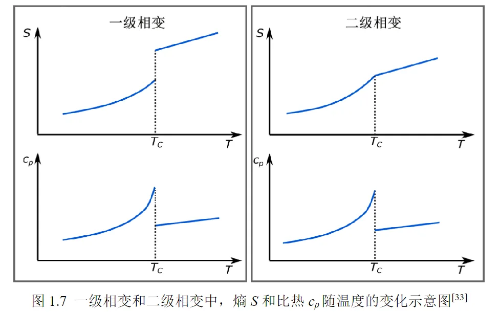 如果一阶导数不连续,则称为一级相变;如果不连续性发生在 G 的二阶导数,则称为二级相变。对于一级相变,熵不连续;而对于二级相变,熵是连续的。