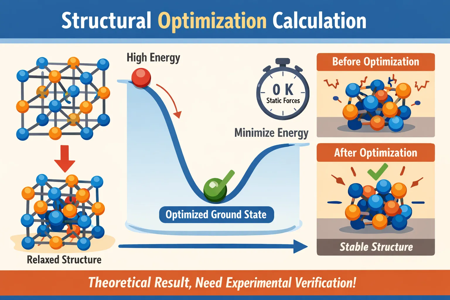 结构优化又叫结构弛豫(structure relax),是指通过对体系的坐标进行调整,使得其能量或内力达到最小的过程,与动力学退火不同,它是一种在0K下用原子间静力进行优化的方法。可以认为结构优化后的结构是相对稳定的基态结构,能够在实验之中获得的几率要大些(当然这只是理论计算的结果,必须由实验来验证)。