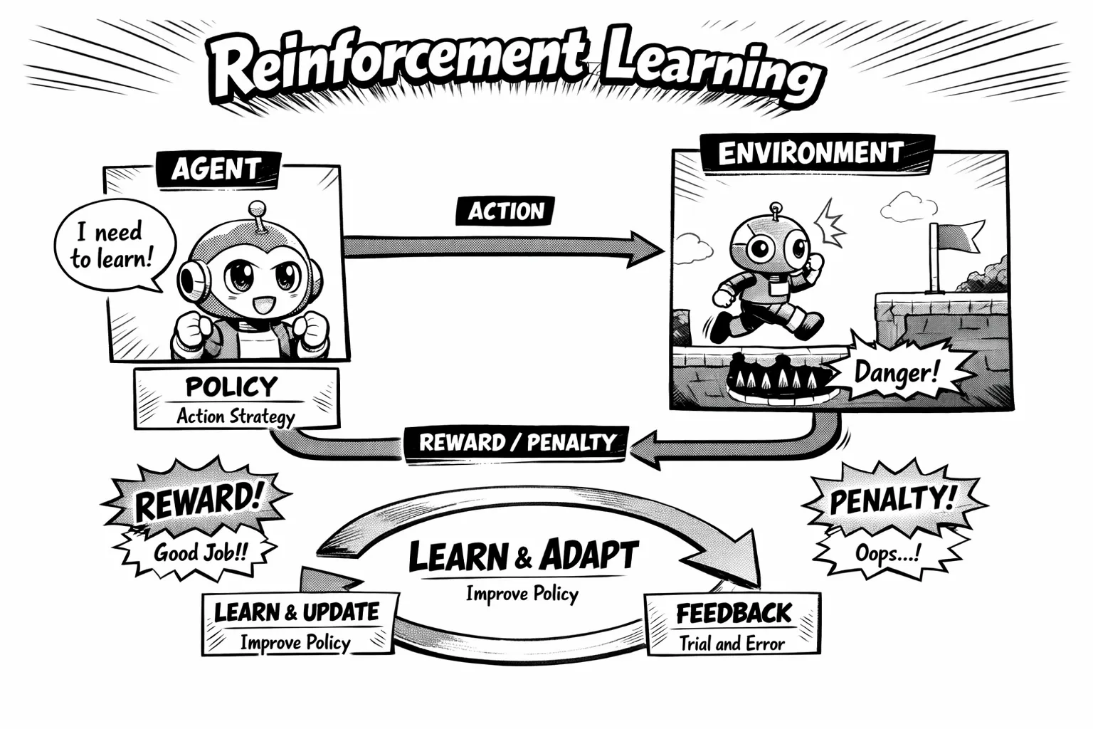 - 探索 (Exploration):尝试未知的动作,旨在发现可能带来更大长期回报的新策略。风险是可能得到负反馈。