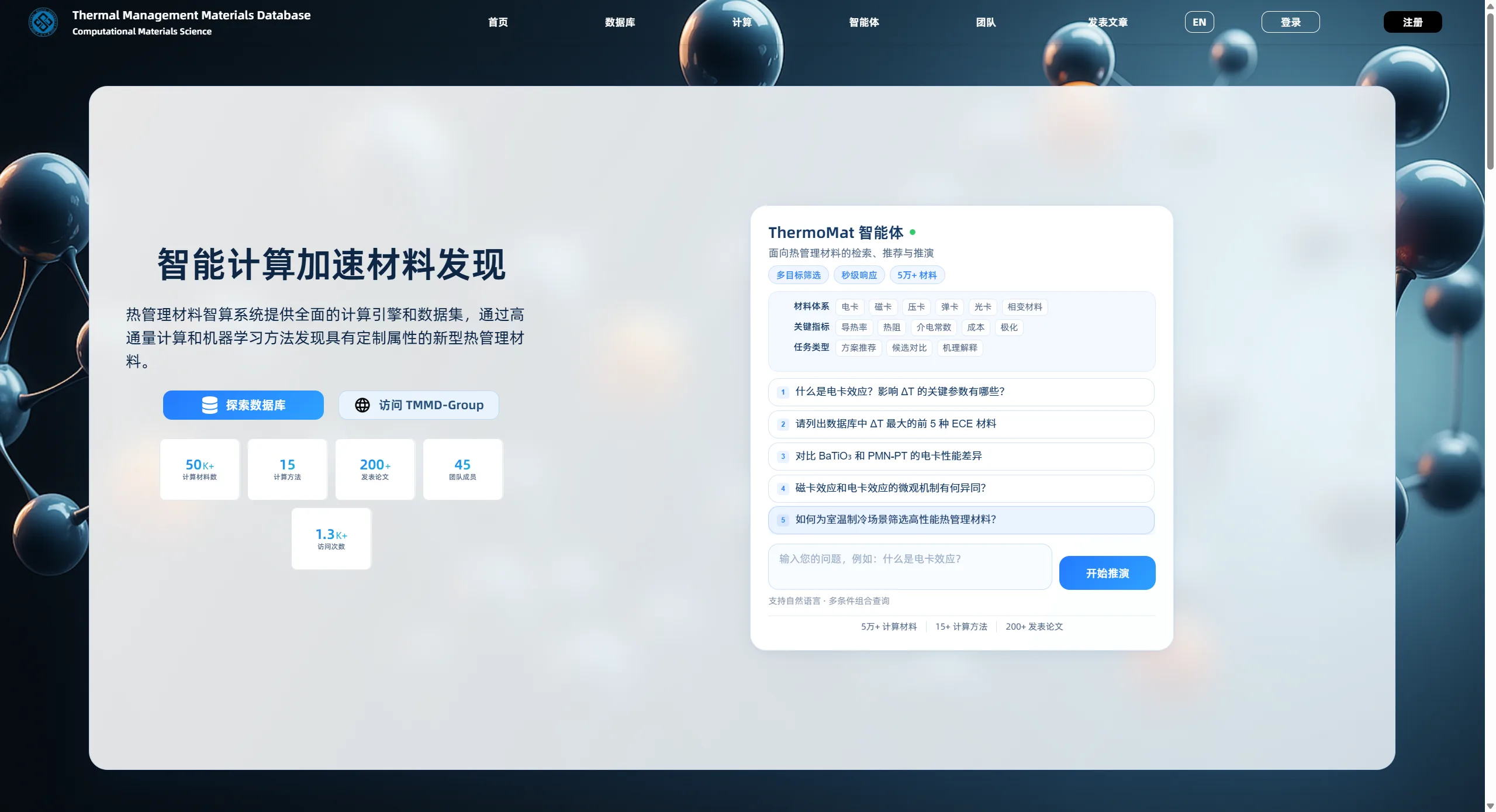 一个围绕热管理材料构建的科研工程平台,整合 MCE、ECE、BCE、OCE、ELCE、TECS、PCET、TEG、TCX 等材料数据模型,提供前后台数据管理、CIF/结构数据查看、Materials Project 信息补全,以及基于 LangGraph 的材料候选筛选与发现智能体。